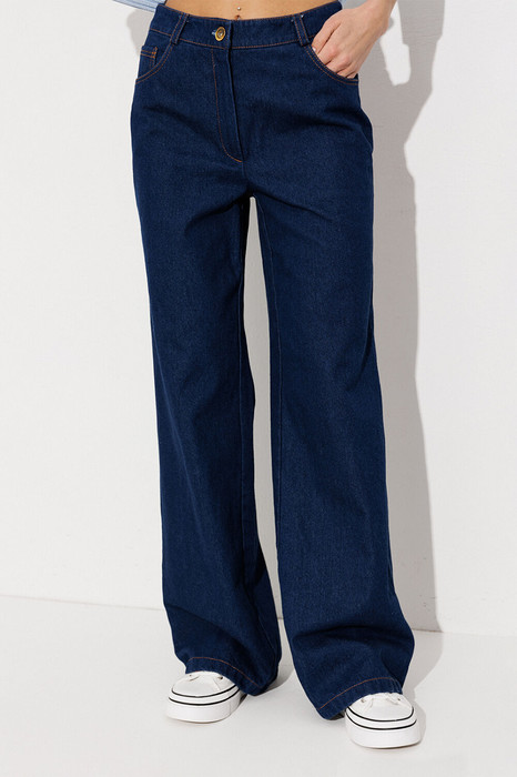 Брюки-джинсы прямого силуэта.  На притачном поясе со шлёвками, застежкой-гульфик. Пояс застегивается на петлю-пуговицу. По переду карманы. По спинке кокетка, накладные карманы.