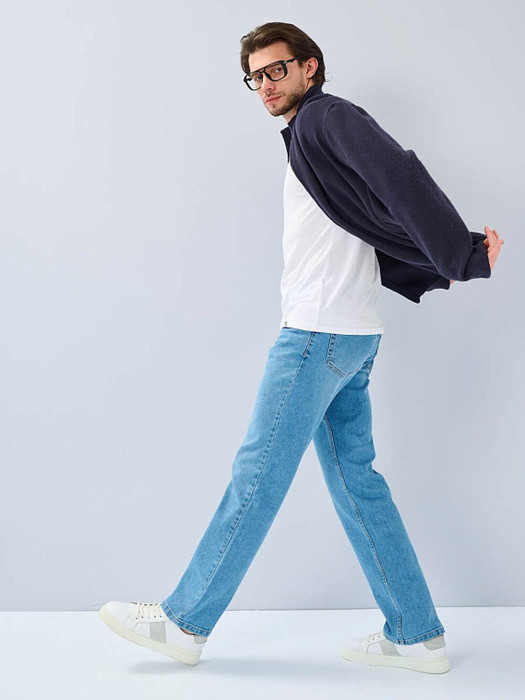 Мужские классические джинсы с пятью карманами. Посадка Regular fit (полуоблегающие по бедру), средняя высота талии. Застежка на молнии. Немного зауженные к низу. Выполнены из слабоэластичной ткани denim comfort stretch. Средняя стирка с потёртостями и "усами" спереди и потёртостями сзади. Параметры указаны для размера 32.Длина внутреннего шва - 85,0 см.