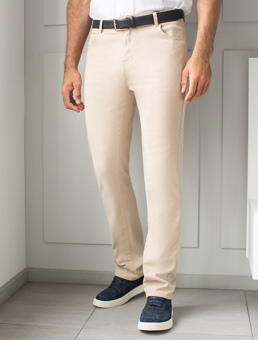 Состав: 100%Хлопок Параметры модели на первом фото: Рост 190, бюст 108, талия 87, бедра 104Бежевые брюки, слегка зауженные к низу, выполнили из 100% хлопкового денима. Изделие комфортно садится по фигуре, обеспечивая свободу движений. Легко сочетается со всеми цветами одежды. Модель дополнили высококачественной фурнитурой бренда.