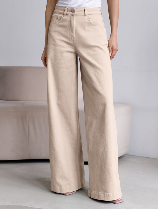 Состав: 98%Хлопок 2%ПУ Плотность: 300 OZ Параметры модели на первом фото: Рост 172, бюст 88, талия 64, бедра 88Джинсы-трубы выполнены из мягкого хлопкового денима с эластаном. Модель свободного кроя с посадкой на талии визуально вытягивает силуэт и подчеркивает достоинства. Отлично впишется в расслабленные летние образы. Наличие эластана в составе способствует формустойчивости и комфортной носке. Изделие дополнено брендированным патчем из эко-кожи и сочетается в костюме с курткой D51.033