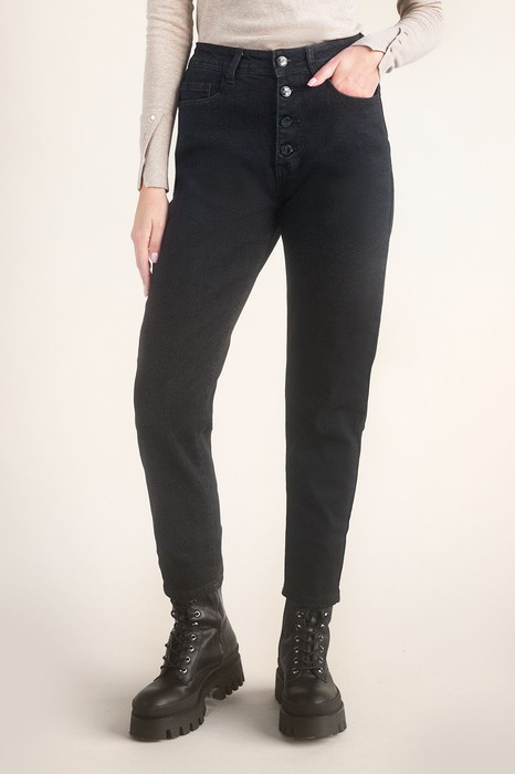 Состав: 75%Хлопок 23%ПЭ 2%ПУГлавный must have осенне-зимнего сезона - черные джинсы mom-fit c завышенной талией. Выполнены из плотного эластичного денима. Эффекный элемент - застежка на черные болты - выделит из толпы и украсит любой лук ненавязчивым блеском.
