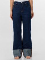 Брюки из джинса, прилегающего силуэта, слегка расклешенные к низу. Средняя посадка, пояс притачной, застежка спереди на молнию и пуговицу. По переду боковые карманы, вертикальные швы заканчиваются вставкой из кружева, сзади под кокеткой накладные карманы с кружевной отделкой.