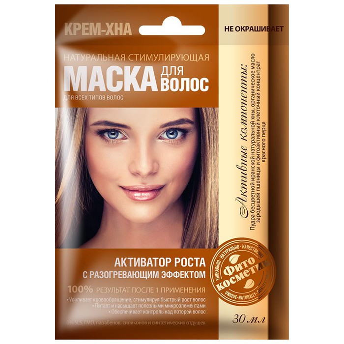 Стимулирующая маска Активатор роста Фитокосметик на основе бесцветной хны ускоряет рост волос, глубоко питает, укрепляет, омолаживает, придает волосам максимальную прочность, удивительную мягкость и яркий блеск.