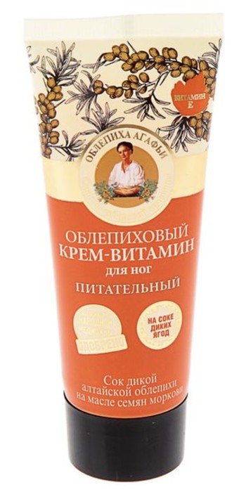 Облепиховый крем-витамин для ног на основе сока диких ягод насыщает кожу витаминами, смягчает, надолго сохраняя ощущение комфорта.