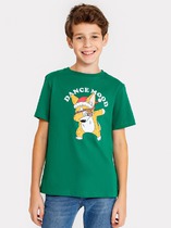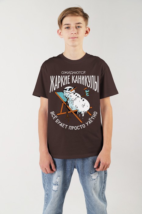 Футболка для мальчика классического покроя: с короткими втачными рукавами, горловиной овальной формы, обработанной втачной планкой, и принтом в центре переда, выполненным в технике шелкографии. По шву втачивания планки в горловину настрочена отделочная строчка на двухигольной машине. неижние срезы рукавов и изделия обработаны подгибкой.