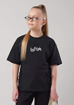 Футболка оверсайз для мальчика из трикотажного полотна: хлопкового с добавлением лайкры. Модель с принтом на переде, спущенной линией плеч, рукавами длиной до локтя.