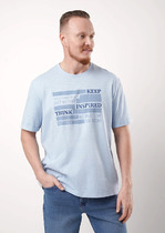Футболка мужская с короткими рукавами, удлиненными плечевыми швами, горловиной овальной формы, обработанной втачной планкой и принтом на детали переда, выполненным в технике шелкографии. По шву втачивания планки в горловину настрочена отделочная строчка. Нижние срезы руквов и изделия обработаны швом вподгибку.