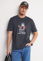 Футболка мужская из трикотажного полотна "кулирка-варенка", с удлиненными плечевыми швами, втачными короткими рукавами, горловиной овальной формы, обработанной втачной планкой, и принтом на детали переда, выполненным в технике шелкографии. По горловине изделия настрочена отделочная строчка.