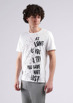 Футболка мужская из трикотажного полотна "кулирка-варенка", с короткими рукавами покроя "реглан", горловиной овальной формы, обработанной втачной планкой, и принтом в центре детали переда, выполненным в технике шелкографии. По швам реглана и горловине настрочены отделочные строчки.