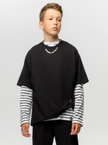 Футболка из хлопкового трикотажа, декорированная контрастным принтом с яркой надписью из переворачивающихся пайеток спереди. Прямой крой, круглый вырез горловины, короткие разрезы по бокам и слегка удлиненная спинка.На ребенке представлен размер 110:- Ширина изделия по линии груди 30,5 см- Ширина по низу изделия 32,5 см- Длина изделия 42 смРазница между размерами составляет 1,5 см.