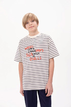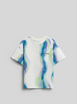 Яркая трикотажная футболка с блестящим принтом на груди и декоративными оборками по бокам. Прямой крой, круглый вырез горловины.На ребенке представлен размер 110:- Ширина изделия по линии груди 36,5 см- Ширина по низу изделия 34,5 см- Длина изделия 39,5 смРазница между размерами составляет 1,5 см.