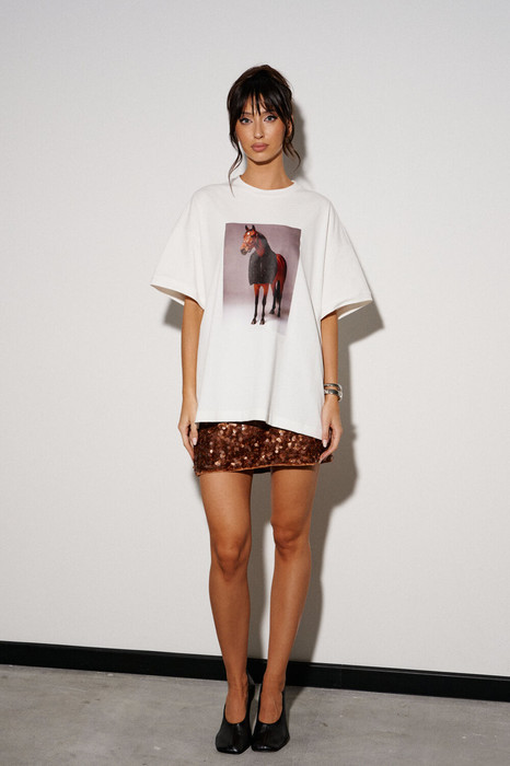 Футболка прямого свободного кроя, выполнена из трикотажного полотна молочного цвета. Характеристика: прямой крой, овальная горловина. Рукав спущен. Спинка цельнокраеная, по переду напечатан принт. Длина спинки 68см, длина рукава от края горловины 41см.
