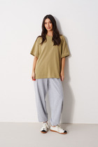 Футболка прямого свободного кроя, выполнена из трикотажного полотна оливкого цвета. Характеристика: прямой крой, овальная горловина выполнена из довяза, рукав вточной спущенный, край выполнен из довяза, спинка цельнокраеная, на спинке под горловиной брендированная нашивка "ANNETE". Длина по спинке 68см, длина рукава от края горловины 40см.
