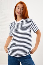 Футболка женская, свободного силуэта со спущенным рукавом из хлопкового трикотажа в полоску.Круглая горловина, обработана белой обтачкой из рибаны.Футболку можно сочетать с джинсами, юбками или шортами.