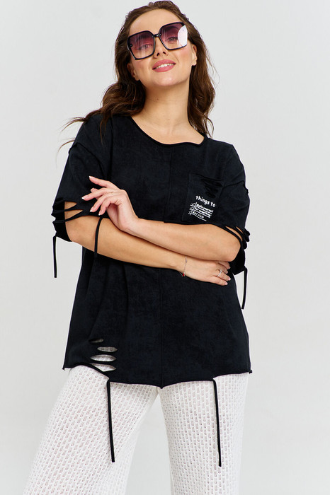 Футболка из хлопковой кулирки с "мраморным" принтом, свободного силуэта, с коротким рукавом и круглой горловиной. Перед и спинка со средними швами налицо. На переде накладной карман. Изделие декорировано авторскими принтами и эффектными прорезями.