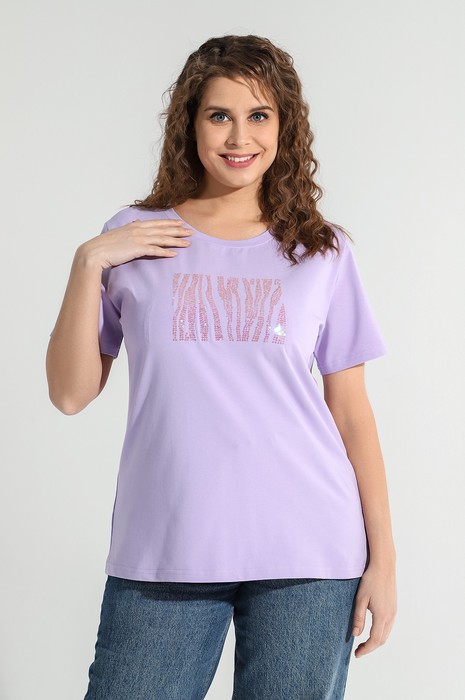 Футболка женская из гладкокрашеного трикотажного полотна «кулирка с лайкрой», свободного покроя, с втачными короткими рукавами и вышивкой пайетками на полочке. Горловина овальной формы обработана втачной планкой с отделочной строчкой по шву притачивания.