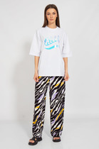 Джемпер выполнен из трикотажного полотна, прямого покроя, длиной до линии бедер. Перед и спинка цельные. Горловина округлой формы. Плечевой шов спущен. Рукав одношовный, длиной до линии локтя. Перед декорирован принтом.