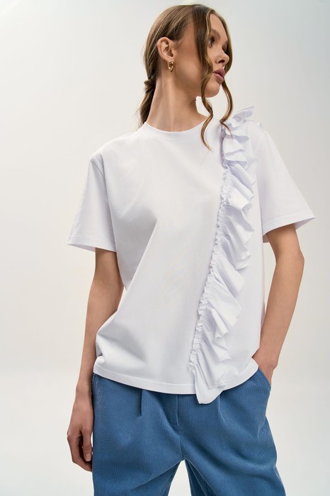 В этой футболке с воланом от GOwear вы не останетесь незамеченной! Вы легко сможете собрать много стильных образов с вашими юбками, шортами, жакетами и брюками!