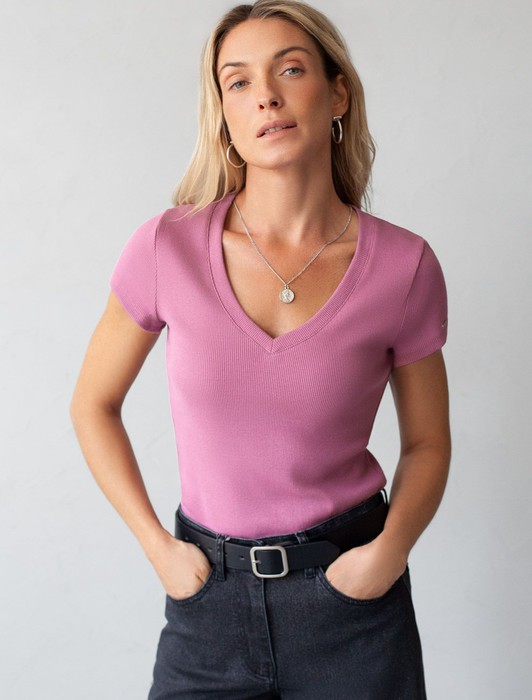 Состав: 95%Хлопок 5%ПУСтильная облегающая футболка грязно-розового цвета с V-образным вырезом сшита из плотного хлопкового трикотажа в рубчик с добавлением эластана, что гарантирует комфортную посадку по фигуре. V-вырез подчеркивает линию декольте, добавляя образу нотку элегантности. Практичная модель, которая не деформируется после стирок и сочетается с любым стилем одежды - от кэжуал до смарт-кэжуал.
