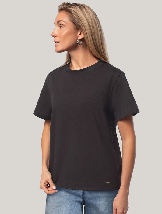 Состав: 92%Хлопок 8%ПУ Параметры модели на первом фото: Рост 172, бюст 88, талия 64, бедра 88Футболка выполнена из премиального хлопка. Наличие эластана в составе гарантирует абсолютный комфорт и долговечность изделия. Базовая модель впишется в любой гардероб. Дополнительным украшением служит металлическим логотипом бренда.