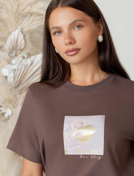 Футболка выполнена из премиального хлопка. Авторский принт нанесен фактурными красками и фольгой с устойчивым покрытием. Наличие эластана в составе гарантирует комфорт и формоустойчивость. Принт станет дополнением не только в повседневных сочетаниях, но и отлично подойдет к вечерним образам. Изделие дополнено фирменным металлическим логотипом бренда.