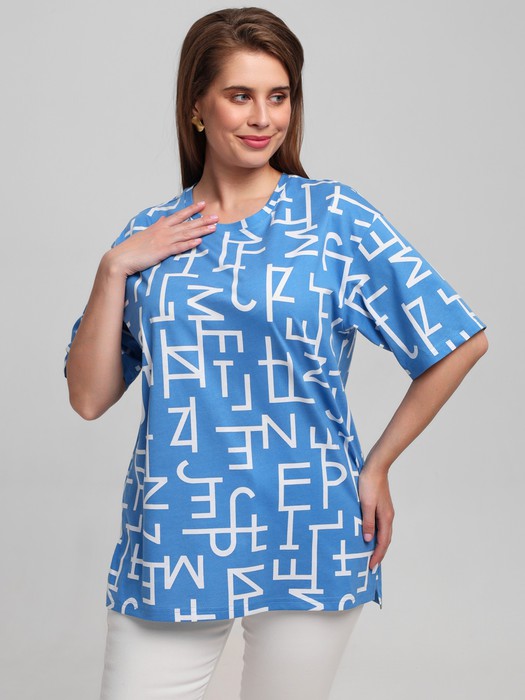 Футболка женская из трикотажного полотна «кулирка» с набивным рисунком, свободного покроя, со спущенным плечом и втачными рукавами длиной до локтя, горловиной овальной формы, обработанной притачной бейкой, в нижней части боковых швов – разрезы.