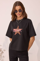 Футболка из гладкокрашеного трикотажного полотна «кулирка» с эффектом «варенки», свободного покроя, горловиной овальной формы, обработанной притачной планкой. Низ рукавов и изделия состоит из двух частей, одна из которых с необработанным краем, другая с подгибкой и соединенных между собой накладным швом.