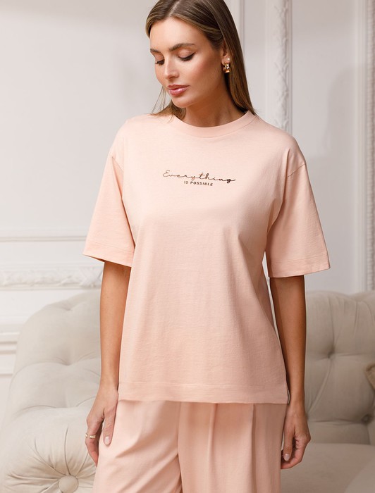 Состав: 100%Хлопок Плотность: 140 Г/м2Оверсайз футболка пудрового цвета выполнена из премиального 100% хлопка плотностью 140 Г/м2. Главная особенность этого изделия — тонкое кулирное полотно, которое легче и воздушнее стандартного варианта. Благодаря своей деликатной текстуре футболка идеально подходит для домашних образов и пижамных комплектов. Ткань отлично дышит, обеспечивая максимальный уют во время сна и отдыха. Особое внимание привлекает стильный принт в виде надписи. Перевод надписи: Everything is possible - Все возможно. Принт выполнен красками с устойчивым покрытием, который добавляет футболке оригинальности и позволяет выразить индивидуальность. Свободный крой футболки дарит удобство и не стесняет движений, что делает ее идеальной для повседневной носки или активного отдыха, подчеркивает современный взгляд на моду. Подойдет девушкам и женщинам на любую фигуру, вы будете чувствовать себя в ней уверенно и комфортно. Отлично впишется в гардероб благодаря универсальному дизайну, который легко сочетать с любыми низами.
