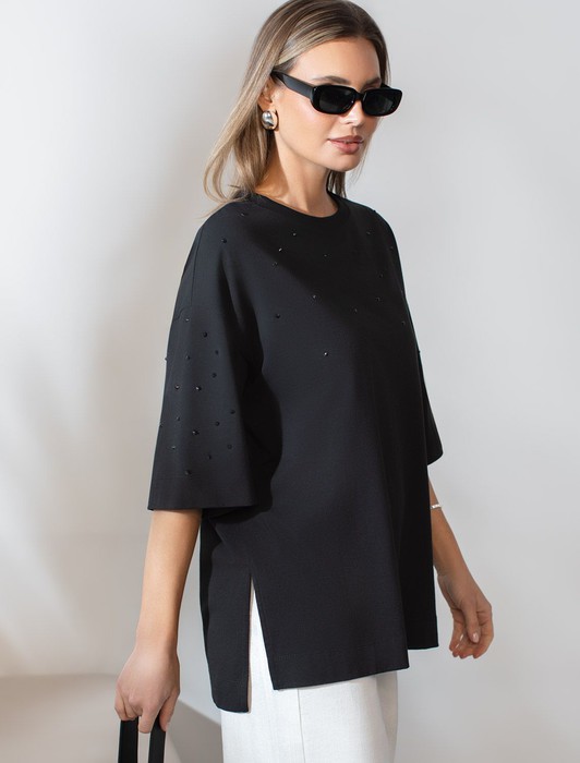 — Футболка оверсайз с принтом стразами из премиального хлопка