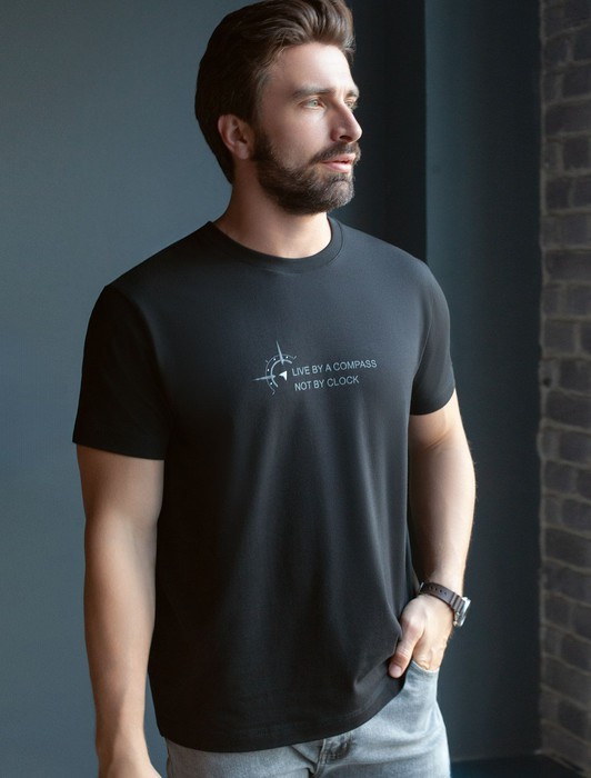 Состав: 92%Хлопок 8%ПУ Плотность: 170 Г/м2Футболка черного цвета из премиального хлопка с эластаном плотностью 170 Г/м2 станет универсальным решением для любого случая. Прямой крой обеспечивает комфортную посадку на любую фигуру, включая большие размеры, подходит как на низкий, так и на высокий рост. Благодаря сочетанию натурального хлопка и эластана, ткань отлично дышит и слегка тянется, сохраняя форму после стирок. Однотонная футболка выполнена в минималистичном стиле, дополнена принтом в виде изображения компаса и надписи. Перевод надписи: Live by a compas not by clock - Жить по компасу, а не по часам. На рукаве нашивка из эко-кожи с логотипом VILATTE. Подходит как классический вариант для работы в офис, так и для повседневной носки или занятий спортом. Мягкая ткань приятна к телу, не вызывает дискомфорта и идеально подходит для дома или летних прогулок. Простая и практичная футболка с коротким рукавом станет базовым элементом вашего гардероба. Она легко сочетается в спортивном или классическом стиле.