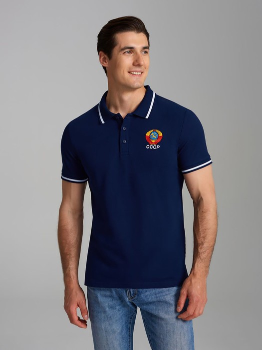 Футболка-поло из хлопкового полотна "пике". Классическая модель поло с короткими рукавами. Воротник и манжеты рукава выполнены из трикотажной рибаны темно-синего цвета с белой полосой. На полочке застежка-планка на пуговицах. На груди вышивка "СССР". По низу футболки в боковых швах выполнены разрезы, обработанные тесьмой.