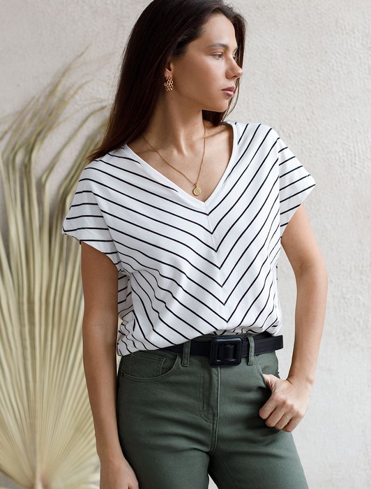 Состав: 92%Хлопок 8%ПУ Плотность: 170 Г/м2 Параметры модели на первом фото: Рост 170, бюст 83, талия 64, бедра 88Футболка выполнена из эластичного хлопка. Модель с цельнокроеным рукавом и V-вырезом, который подчеркивают геометрично соединенные полосы. В отличии от классической горизонтальной полоски, такой орнамент стройнит и вытягивает силуэт. Изделие дополнено металлическим логотипом бренда.