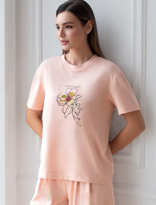 Состав: 100%Хлопок Плотность: 140 Г/м2Футболка пудрового цвета выполнена из премиального 100% хлопка плотностью 140 Г/м2. Главная особенность этого изделия — тонкое кулирное полотно, которое легче и воздушнее стандартного варианта. Благодаря своей деликатной текстуре футболка идеально подходит для домашних образов и пижамных комплектов. Ткань отлично дышит, обеспечивая максимальный уют во время сна и отдыха. Особое внимание привлекает стильный принт контрастного цвета в виде цветка с надписью. Перевод надписи: Be the energy you vant to attract - Будь той энергией, которую хочешь привлечь. Принт выполнен красками с устойчивым покрытием, который добавляет изделию оригинальности и позволяет выразить индивидуальность. Свободный крой футболки дарит удобство и не стесняет движений, что делает ее идеальной для повседневной носки или активного отдыха, подчеркивает современный взгляд на моду. Подойдет девушкам и женщинам на любую фигуру, вы будете чувствовать себя в ней уверенно и комфортно. Лаконичный современный принт делает изделие универсальным: можно создавать стильные образы для прогулок, встреч, занятий спортом и домашних дел. Базовая футболка подходит для любой ситуации и сочетается с разными элементами гардероба.