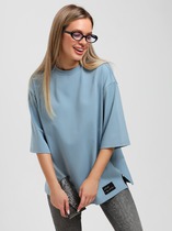 Футболка молодежная из гладкокрашенного полотна «кулирка с лайкрой», свободного покроя, со спущенной линией плеча, втачными рукавами длиной до локтя, горловиной овальной формы, обработанной втачной планкой. Изделие дополнено декоративной нашивкой, в боковых швах выполнены разрезы.
