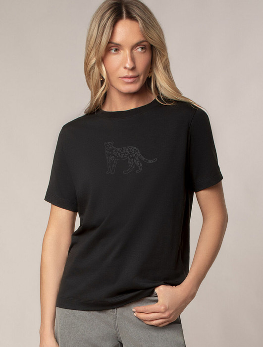Футболка выполнена из премиального хлопка.Принт \"леопард\" нанесен фактурными красками с устойчивым покрытием. Наличие эластана в составе гарантирует комфорт и формоустойчивость. Изделие дополнено фирменным металлическим логотипом бренда.