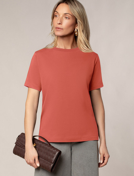 Базовая однотонная футболка из премиального хлопка. Горловина выполнена из рибаны в тон изделия, Добавление эластана в состав изделия способствует формоустойчивости. Самое высокое качество хлопковых волокон обеспечивает комфорт в любое время года. Идеально держит форму и сохраняет внешний вид в течение долговременного использования. Универсальная базовая вещь для ваших стилистических решений. Изделие дополнено металлическим логотипом бренда на рукаве.
