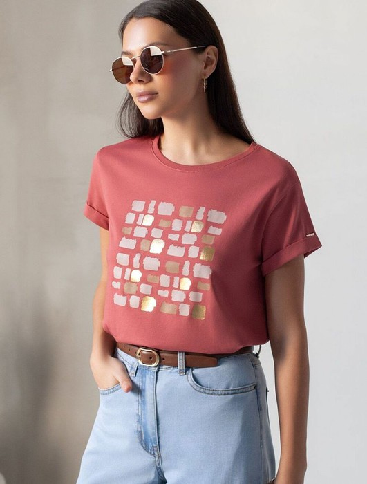 Модная футболка темно-кораллового цвета привлекает внимание своим интересным дизайном и ярким принтом. Благодаря прямому крою изделие комфортно садится на любую фигуру, в том числе на большие размеры, и не сковывает движений. Круглый вырез подчеркивает современный стиль, а натуральный материал из хлопка с добавлением эластана обеспечивает удобство в повседневной носке и приятные тактильные ощущения. Прочность и износостойкая структура сохраняет первоначальную форму футболки после множества стирок. Рукава имеют аккуратные подгибы, что придает изделию завершенность и помогает сохранять аккуратный внешний вид. Принт в виде бликов нанесен золотистыми красками с устойчивым покрытием. Стильная футболка гармонично вписывается в любой гардероб и подойдет для прогулок, отдыха дома или неформальных встреч. Благодаря особенностям кроя модель хорошо сидит, скрывая недостатки и подчеркивая достоинства. Удобная футболка идеально сочетается с базовыми вещами, позволяя создавать новые интересные образы каждый день