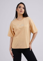 Футболка женская из гладкокрашенного трикотажного полотна «кулирка», свободного силуэта, с боковыми швами, переходящими в рельефы, в правом соединительном шве выполнен разрез. Горловина овальной формы обработана втачной планкой и дополнена декоративным элементом.