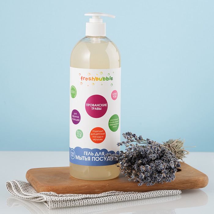 Натуральный гель для мытья посуды «Прованские травы» подходит для детской посуды и игрушек, а также фруктов и овощей.