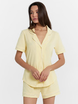 Халат женский из трикотажного полотна «кулирка» с набивным рисунком, прямого силуэта, с короткими втачными рукавами, с горловиной овальной формы, окантованной основным материалом, с рельефами, выходящими из пройм, двумя накладными карманами на уровне бедер и центральной бортовой застежкой на обметанные петли и пуговицы. Нижние срезы рукавов обработаны притачными манжетами, верхние срезы карманов – с притачными планками. В швах соединения манжет и планок с деталями – узкий кант контрастного цвета.