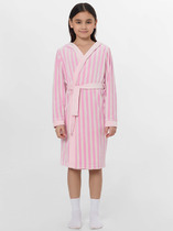 Халат с тонким капюшоном и поясом из набивного хлопкового трикотажа футер петля. Края обработаны мягким кантом. Накладной карман уходит в шов. Пояс продет в шлевки. Длинные рукава обработаны плоскими швами.