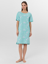 Халат женский из трикотажного полотна «кулирка» с набивным рисунком, расширенный книзу, с короткими цельнокроеными рукавами, отрезное по линии талии и присборенное по соединительному шву. На лифе выполнены рельефы. Изделие с V-образной горловиной, карманами в боковых швах и центральной бортовой застежкой на тесьму «молния».