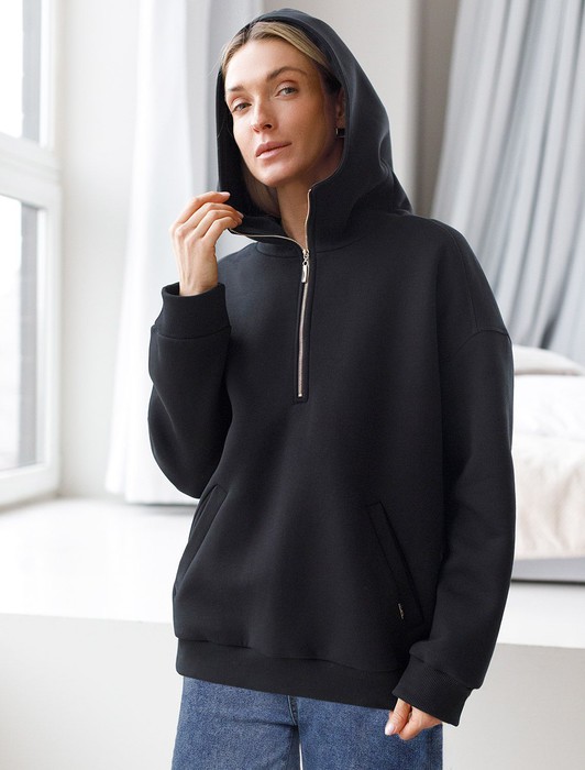 Состав: 80%Хлопок 20%ПЭ Плотность: 320 Г/м2Худи с воротом на молнии выполнено из премиального футера трехнитки с теплым начесом. Модель дополнена боковыми карманами и золотистой фурнитурой, что поддерживает актуальный стиль спорт-шик. Свободный крой подходит для любой фигуры. Ранней осенью или поздней весной можно носить в качестве верхней одежды.