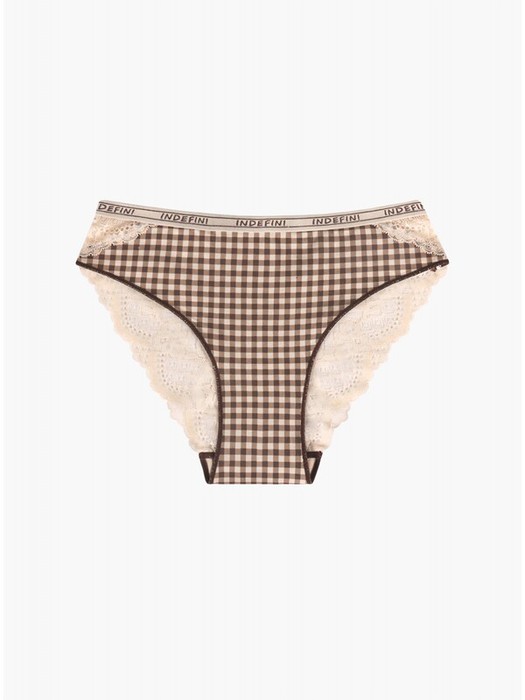 Оригинальный принт в бежево-коричневую клетку придаёт женским труса стильный и современный вид. Кружевные вставки по бокам и на задней части добавляют романтичности и женственности, делая эти трусы-слипы от Indefini не только удобными, но и визуально привлекательными.