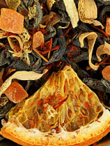 Легендарный ассам, украшенный нежными лепесточками розы и оранжевого сафлора. Солодовые и ментоловые нотки сорта великолепно сочетаются с кубиками цукатов, цельными ягодками черноплодной рябины и органическими маслами. В сухом виде выглядит как расшитый королевский кафтан: на темном чайном фоне красочно рассыпаны алые, розовые, оранжевые и темно-синие вкрапления. В заварочном чайнике ингредиенты кружат в грациозном танце. Запах напитка под стать внешнему виду. Сочные ягодные оттенки переплетаются с нежными цветочными аккордами. Масла, ягоды и цветы гармонично оттеняют благородный вкус ассама.
