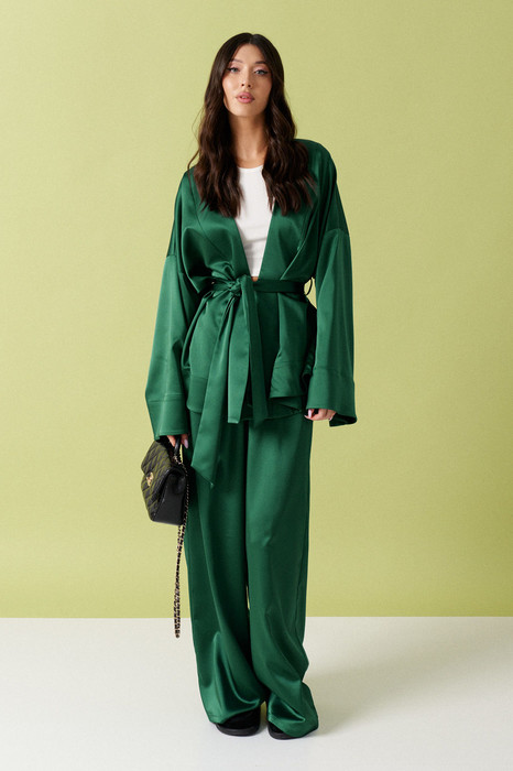 Кардиган прямого кроя выполнен из ткани изумрудного цвета. Характеристики: прямой крой, V образный вырез горловины, горловина и борты обработаны широкой притачной планкой, на запах, по линии талии нашиты шлевки, в комплекте пояс из ткани основного изделия, рукав свободного кроя спущен, по низу рукава широкая манжета. Длина по спинке 69 см, длина рукава 78 см от края горловины.