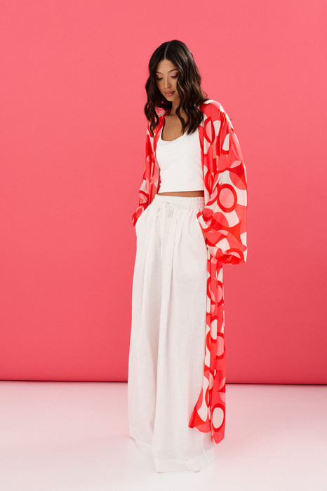 Кардиган прямого свободного кроя выполнен из струящейся ткани с контрастным ярким принтом. Характеристики: прямой свободный крой, рукав широкий цельнокроеный, в боковых швах разрезы, по линии талии нашиты шлевки, в комплекте пояс выполнен из ткани основного изделия. Длина по спинке 139 см, длина рукава от края горловины 70 см.