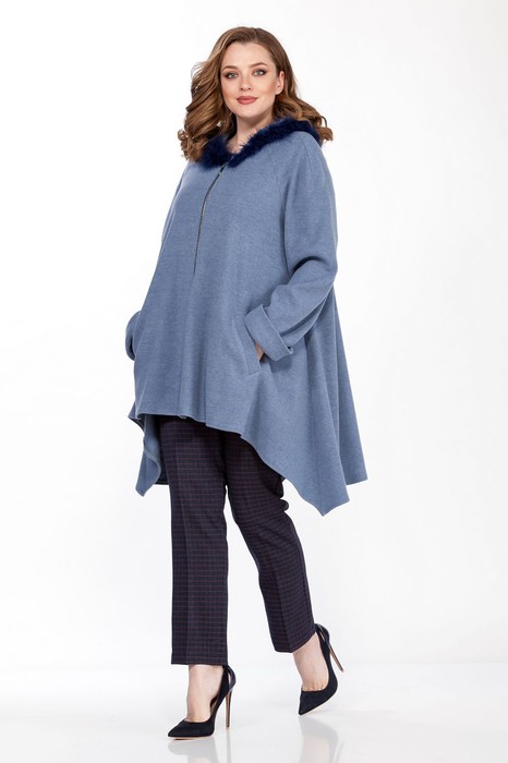 Кардиган женский А- силуэта выполнен из плотной вязаной ткани под ангору, с капюшоном, отделанным натуральным боа, на молнии, на полочках обработаны функциональные карманы с листочкой, рукав реглан с отложными манжетами. Низ кардигана асимметричный, длина по спинке- 89 см, длина рукава от горловины 74 см.