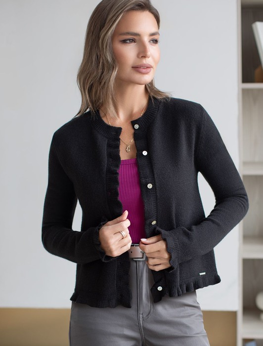 Состав: 52%ПАН (акрил) 33%ПЭ 8%ПУ 7%Кашемир Плотность: 9 GG Размер товара на первом фото: 42Кардиган выполнен из мягкой пряжи с Романтичности прямому силуэту добавляют мягкие воланы по линии пуговиц, на манжетах и краю изделия. Застежка на пуговицы из натурального перламутра. Изделие очень приятное к телу, совершенно не колется и отлично сохраняет тепло. Сочетается в костюме с брюками D38.013, D38.012 и юбкой D36.016