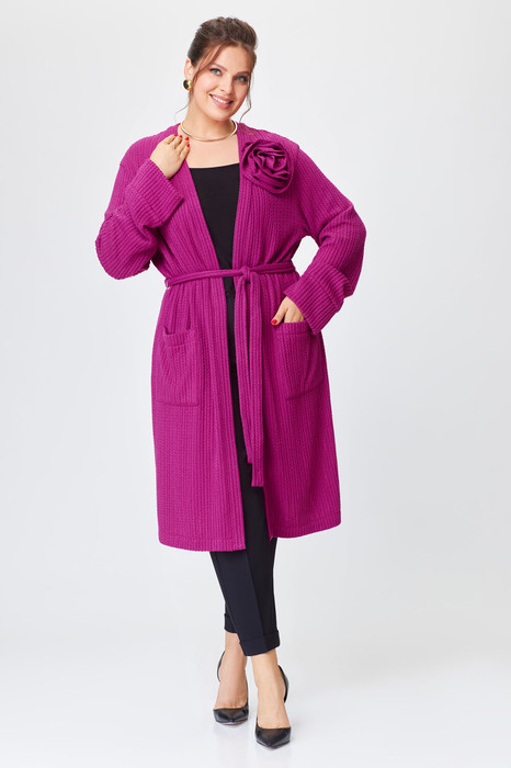 Жакет женский «One Size» прямого силуэта, длиной ниже колена, из эластичной трикотажной ткани.  Жакет без подкладки со съемным поясом и накладными карманами.  По переду и горловине спинки притачная планка, без застежки. Линия плеча слегка спущена. Рукав втачной длинный с отложной манжетой. В боковых швах разрезы. Украшен жакет съемным цветком из отделочной ткани.